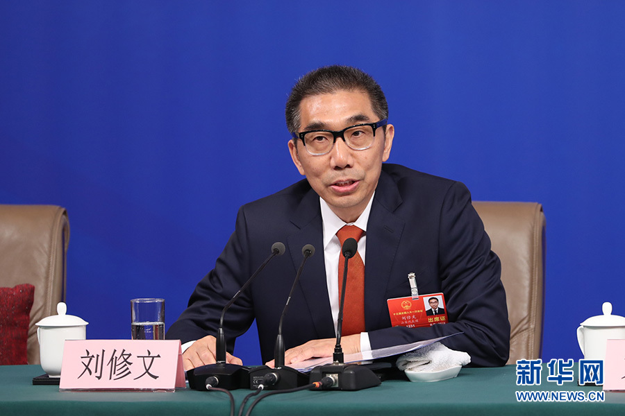 十三屆全國人大一次會議新聞中心于3月12日15時在梅地亞中心多功能廳舉行記者會,邀請十二屆全國人大財經(jīng)委副主任委員尹中卿、教科文衛(wèi)委副主任委員吳恒、環(huán)資委副主任委員袁駟、內(nèi)司委委員鄭功成,全國人大常委會預(yù)算工委副主任劉修文、常委會辦公廳秘書局巡視員傅文杰就“人大監(jiān)督工作”相關(guān)問題回答中外記者提問。圖為全國人大常委會預(yù)算工委副主任劉修文回答記者提問。新華網(wǎng)/中國政府網(wǎng) 陳杰 攝?