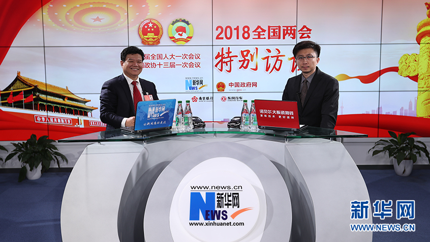 3月13日,全國人大代表、山東省淄博市原山林場黨組書記孫建博(左)做客新華網(wǎng)2018全國兩會特別訪談。新華網(wǎng) 郭小天攝