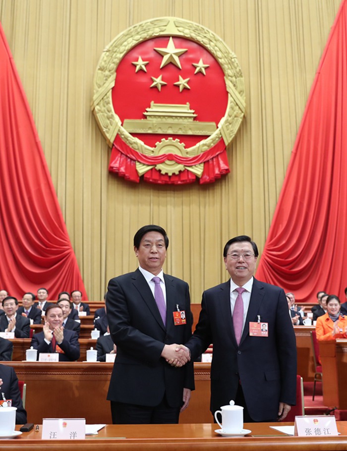 3月17日,十三屆全國(guó)人大一次會(huì)議在北京人民大會(huì)堂舉行第五次全體會(huì)議。栗戰(zhàn)書當(dāng)選為第十三屆全國(guó)人民代表大會(huì)常務(wù)委員會(huì)委員長(zhǎng)。這是栗戰(zhàn)書同十二屆全國(guó)人大常委會(huì)委員長(zhǎng)張德江握手,相互致意。新華社記者 謝環(huán)馳 攝