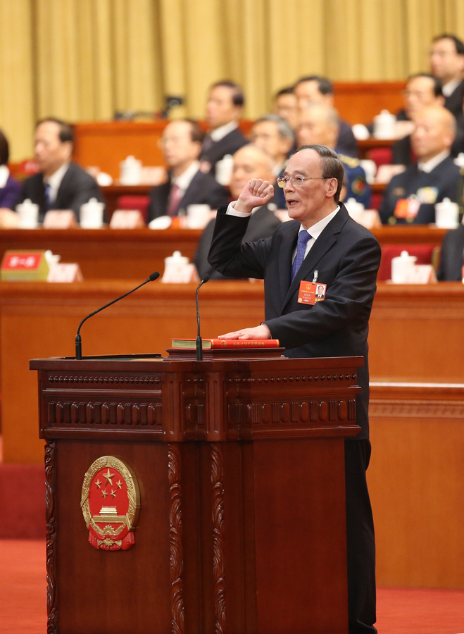 3月17日,十三屆全國人大一次會(huì)議在北京人民大會(huì)堂舉行第五次全體會(huì)議。王岐山當(dāng)選為中華人民共和國副主席。這是王岐山進(jìn)行憲法宣誓。