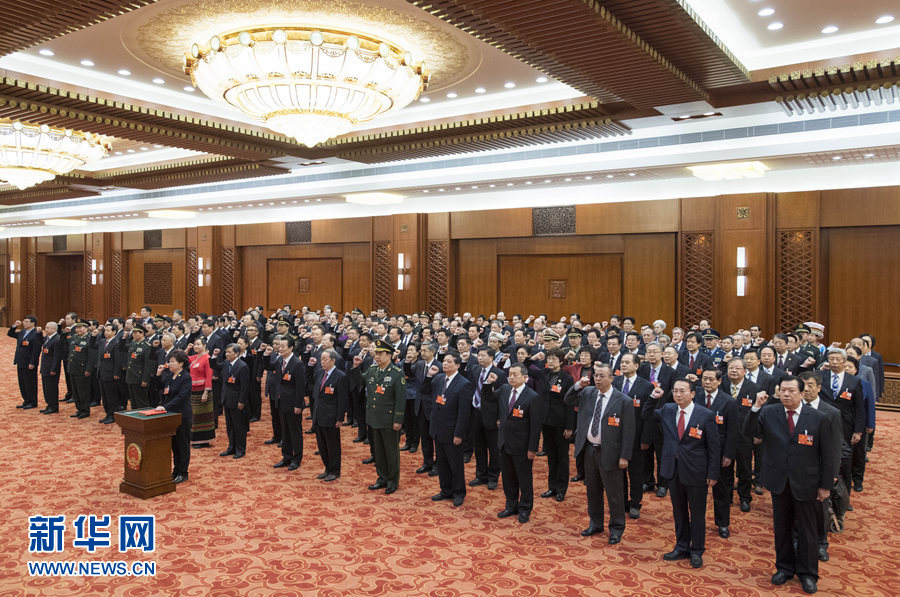 3月18日,十三屆全國人大一次會(huì)議在北京人民大會(huì)堂舉行第六次全體會(huì)議。159位候選人當(dāng)選為第十三屆全國人民代表大會(huì)常務(wù)委員會(huì)委員。這是新當(dāng)選的第十三屆全國人民代表大會(huì)常務(wù)委員會(huì)委員進(jìn)行憲法宣誓。新華社記者 李學(xué)仁 攝