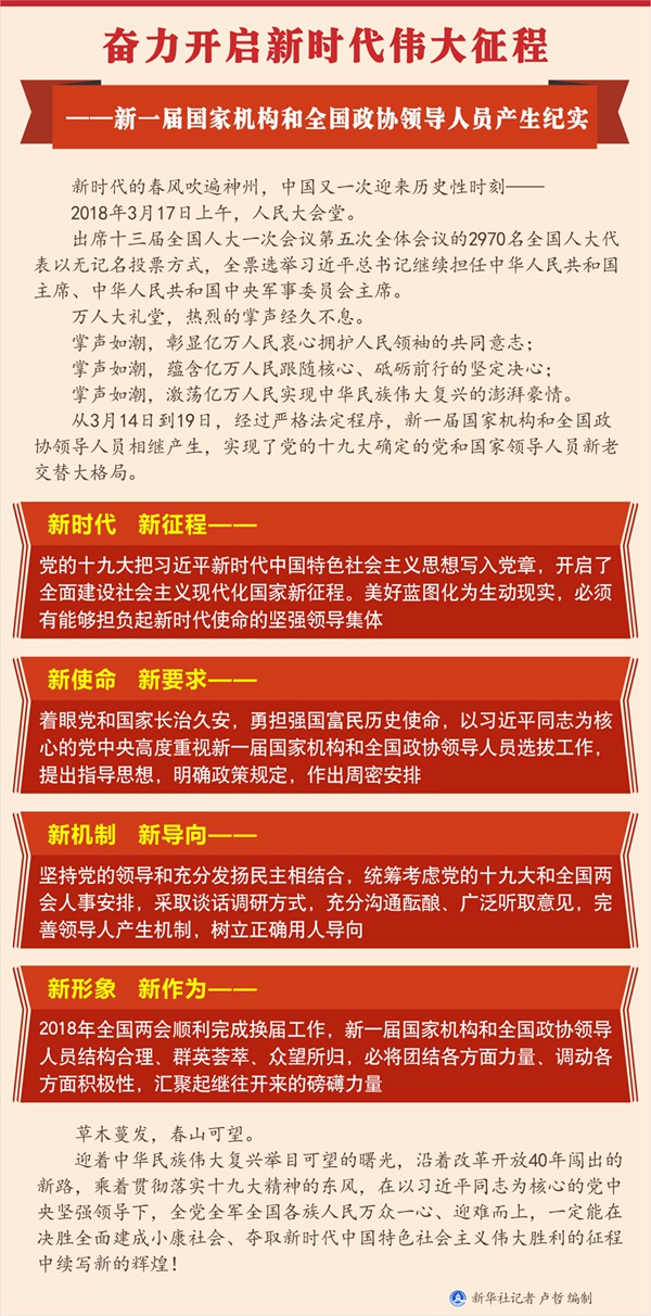 從3月14日到19日,經(jīng)過嚴(yán)格法定程序,新一屆國家機(jī)構(gòu)和全國政協(xié)領(lǐng)導(dǎo)人員相繼產(chǎn)生,實現(xiàn)了黨的十九大確定的黨和國家領(lǐng)導(dǎo)人員新老交替大格局。