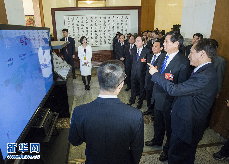 隨后,栗戰(zhàn)書(shū)走進(jìn)設(shè)在人民大會(huì)堂一樓大廳的新華社兩會(huì)新聞報(bào)道中心,仔細(xì)觀看了微視頻《誓言》、人工智能產(chǎn)品《“媒體大腦”帶你看憲法宣誓》、新華社兩會(huì)報(bào)道實(shí)時(shí)大數(shù)據(jù)展示、新華網(wǎng)“奮進(jìn)新時(shí)代 筑夢(mèng)新征程”兩會(huì)融媒體專題等,看望正在這里緊張工作的采編和技術(shù)人員,與參加兩會(huì)報(bào)道的新華社外籍記者親切交談。在觀看了新華社制作的融媒體產(chǎn)品《“90后”全國(guó)人大代表程桔:小丫回村當(dāng)書(shū)記》后,栗戰(zhàn)書(shū)對(duì)新聞媒體創(chuàng)新兩會(huì)報(bào)道給予充分肯定。
