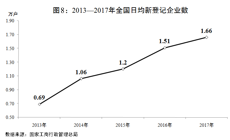 二是大眾創(chuàng)業(yè)萬眾創(chuàng)新不斷深化?!秶鴦?wù)院關(guān)于強化實施創(chuàng)新驅(qū)動發(fā)展戰(zhàn)略進一步推進大眾創(chuàng)業(yè)萬眾創(chuàng)新深入發(fā)展的意見》(國發(fā)〔2017〕37號)印發(fā)實施。新支持92個國家雙創(chuàng)示范基地建設(shè),建成4298家眾創(chuàng)空間、3255家科技企業(yè)孵化器和400余家企業(yè)加速器,第三屆全國雙創(chuàng)活動周及“創(chuàng)響中國”巡回接力活動成功舉辦。全年新登記企業(yè)達到607.4萬戶,增長9.9%,日均新登記企業(yè)達到1.66萬戶。
