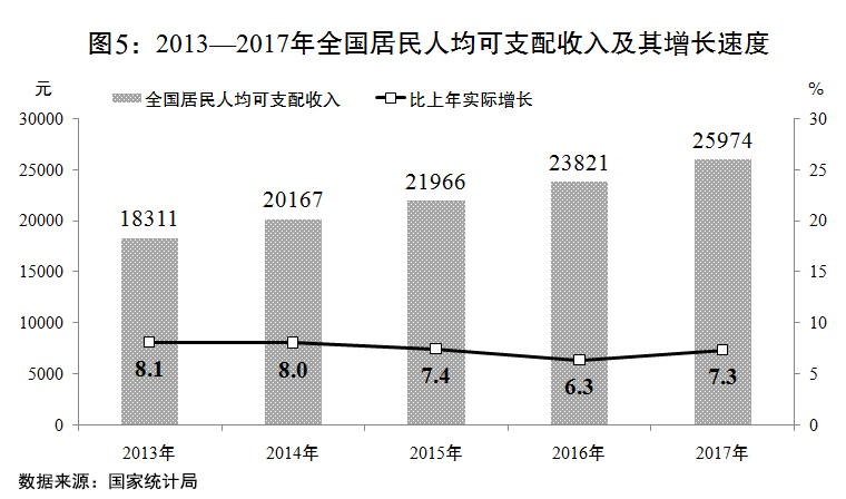 全國居民人均可支配收入達到25974元,實際增長7.3%,高于國內(nèi)生產(chǎn)總值增速0.4個百分點,農(nóng)村居民收入增長繼續(xù)快于城鎮(zhèn)居民。