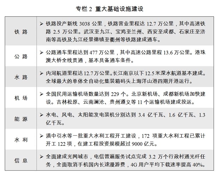 四是加強水利交通能源等基礎(chǔ)設(shè)施建設(shè)。今年要完成鐵路投資7320億元、公路水運投資1.8萬億元左右,水利在建投資規(guī)模達到1萬億元。再開工一批重大水利工程,加強中小河流治理、小型病險水庫除險加固等水利薄弱環(huán)節(jié)建設(shè)。加快建設(shè)北京至沈陽、商丘經(jīng)合肥至杭州、鄭州至萬州高鐵,開工建設(shè)北京至雄安、和田至若羌等鐵路。有序發(fā)展高速公路,支持普通國省干線提級改造。進一步完善通江達海、干支銜接的航道網(wǎng)絡(luò),提高干線航道通航能力和支線航道等級。積極推進北京、成都、青島等新機場建設(shè),推進一批樞紐機場改擴建和支線機場項目建設(shè)。支持符合條件的城市有序發(fā)展城市軌道交通。推動“互聯(lián)網(wǎng)+”便捷交通建設(shè),提升綜合交通服務(wù)質(zhì)量。加快構(gòu)建便捷高效、綠色安全骨干物流基礎(chǔ)設(shè)施網(wǎng)絡(luò)。落實能源生產(chǎn)和消費革命戰(zhàn)略,推進能源革命試點示范,開展非化石能源跨越發(fā)展行動,構(gòu)建清潔能源消納長效機制,加快傳統(tǒng)能源清潔高效利用,加強電網(wǎng)、油氣管網(wǎng)布局優(yōu)化和互聯(lián)互通,增強天然氣供給保障能力和油氣儲備應(yīng)急能力。