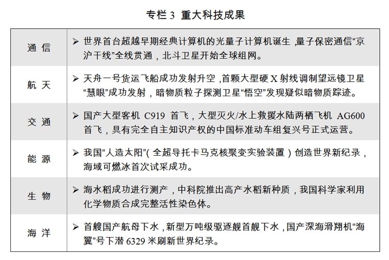 一批重大科技成果涌現(xiàn),“慧眼”衛(wèi)星成功發(fā)射運行,C919大型客機首飛,量子計算機研制取得重大突破,首艘國產(chǎn)航母順利下水,海域可燃冰首次試采成功。全面創(chuàng)新改革試驗深入推進,169項先行先試改革舉措全面啟動,其中13項改革舉措向全國推廣。北京、上??萍紕?chuàng)新中心,北京懷柔、上海張江、安徽合肥三個綜合性國家科學中心加快建設(shè)。國家實驗室建設(shè)啟動,國家重大科技基礎(chǔ)設(shè)施建設(shè)持續(xù)推進。國家科技重大專項加速攻堅,“科技創(chuàng)新2030-重大項目”啟動實施。研發(fā)費用加計扣除、股權(quán)激勵和技術(shù)入股所得稅優(yōu)惠政策、完善高新技術(shù)企業(yè)認定辦法等進一步落實,17家國家自主創(chuàng)新示范區(qū)、156家國家高新區(qū)形成區(qū)域創(chuàng)新發(fā)展的核心載體和重要引擎。