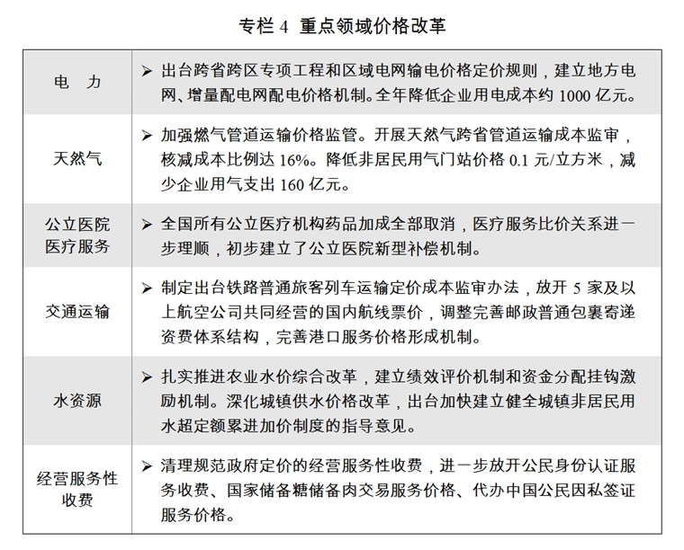 五是價格改革繼續(xù)深化。全面深化價格機制改革的意見出臺實施。持續(xù)推進能源領(lǐng)域價格改革,完成首輪省級電網(wǎng)輸配電價改革,降低非居民用氣基準門站價格,天然氣全產(chǎn)業(yè)鏈價格監(jiān)管制度基本建立。公立醫(yī)院藥品加成全部取消,公立醫(yī)療機構(gòu)特需等醫(yī)療服務(wù)定價穩(wěn)步放開。交通運輸價格改革加快推進。水資源價格改革穩(wěn)步推進。