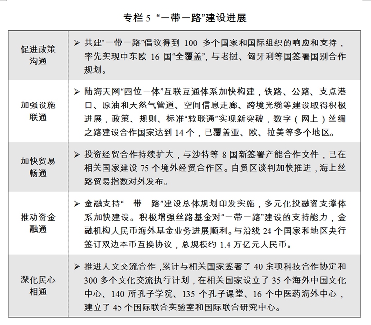 ?。┮浴耙粠б宦贰苯ㄔO(shè)為重點,開放型經(jīng)濟新體制穩(wěn)步健全。著力提高“引進來”水平,持續(xù)改善“走出去”結(jié)構(gòu),更深層次更高水平的全方位開放格局加快形成。