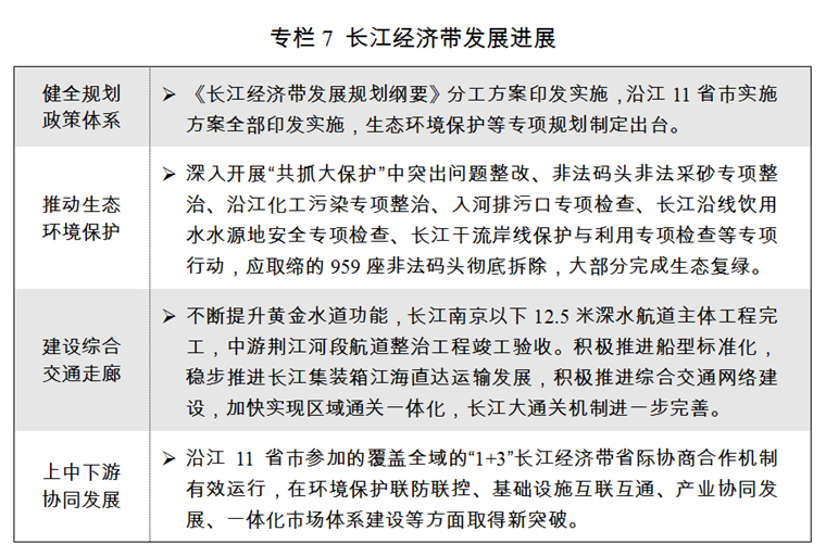 三是長江經(jīng)濟帶發(fā)展取得積極進展。全面落實《長江經(jīng)濟帶發(fā)展規(guī)劃綱要》,省際合作協(xié)商機制有效運行,“共抓大保護”格局初步形成。非法碼頭非法采砂整治、飲用水水源地安全檢查等專項行動深入開展,負面清單、跨界斷面考核等生態(tài)環(huán)保制度建設(shè)加快推進,水環(huán)境治理、水生態(tài)修復和水資源保護等重大工程大力實施。綜合立體交通走廊加快建設(shè),上海、武漢、重慶三大航運中心建設(shè)進展順利,滬蓉、滬渝、滬昆高速公路全線通車。