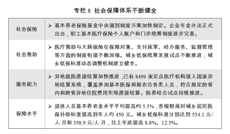 二是社會保障體系不斷健全。養(yǎng)老保險制度頂層設(shè)計取得關(guān)鍵性進展,劃轉(zhuǎn)部分國有資本充實社保基金實施方案印發(fā)實施。城鄉(xiāng)居民基本醫(yī)療保險制度整合深入推進,異地就醫(yī)直接結(jié)算取得重要突破,所有省級異地就醫(yī)結(jié)算系統(tǒng)、所有統(tǒng)籌地區(qū)均與國家異地就醫(yī)結(jié)算系統(tǒng)實現(xiàn)對接。高齡津貼制度已在全國31個省份和新疆生產(chǎn)建設(shè)兵團實現(xiàn)全覆蓋。城鎮(zhèn)職工基本養(yǎng)老和城鄉(xiāng)居民養(yǎng)老保險參保人數(shù)分別達到4.02億人和5.13億人。城鎮(zhèn)棚戶區(qū)住房改造開工609萬套。