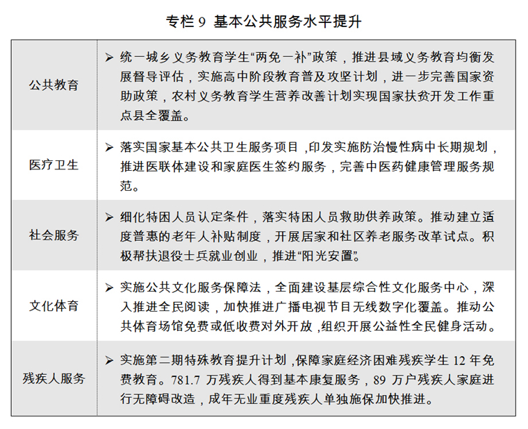 三是不斷增強公共產(chǎn)品和服務(wù)供給能力。進一步提高基本公共服務(wù)均等化水平,制定基本公共服務(wù)標準體系指導意見。堅持教育優(yōu)先發(fā)展,深化教育領(lǐng)域綜合改革,促進城鄉(xiāng)義務(wù)教育一體化發(fā)展,持續(xù)改善薄弱學校基本辦學條件,著力解決中小學生課外負擔重、“擇校熱”、“大班額”等突出問題。多渠道增加學前教育資源供給,加強嬰幼兒照護和兒童早期教育服務(wù)。推進普及高中階段教育。深化產(chǎn)教融合,拓寬社會力量舉辦職業(yè)教育空間,擴大企業(yè)新型學徒制和現(xiàn)代學徒制試點。加快“雙一流”建設(shè)。發(fā)展民族教育、特殊教育、繼續(xù)教育和網(wǎng)絡(luò)教育。加強師資隊伍和師德師風建設(shè)。2018年,九年義務(wù)教育鞏固率預期目標達到94.2%,高中階段教育毛入學率預期目標達到88.9%,普通高等教育本??普猩A期目標達到755萬人。深入實施健康中國戰(zhàn)略,提升全民健康素質(zhì)。深化醫(yī)藥衛(wèi)生體制改革,推進分級診療,加強基層醫(yī)療衛(wèi)生服務(wù)體系和全科醫(yī)生、兒科醫(yī)生隊伍建設(shè),實施新一輪改善醫(yī)療服務(wù)計劃,提升疑難病癥診治能力,健全藥品供應(yīng)保障制度,支持中醫(yī)藥事業(yè)傳承創(chuàng)新發(fā)展。推進實施食品安全戰(zhàn)略。全面放開養(yǎng)老服務(wù)市場,推進醫(yī)養(yǎng)結(jié)合,大力推進實施社會服務(wù)兜底工程。切實加強婦女、未成年人、殘疾人等社會群體權(quán)益保護,健全農(nóng)村留守兒童和婦女、老年人關(guān)愛服務(wù)體系,加快推進無障礙環(huán)境建設(shè)。推動實施國家人口發(fā)展規(guī)劃,研究制定國家積極應(yīng)對人口老齡化中長期規(guī)劃,進一步完善全面兩孩配套政策,健全人口預測預報預警機制。完善公共服務(wù)法律體系。貫徹落實公共文化服務(wù)保障法,構(gòu)建現(xiàn)代公共文化服務(wù)體系,實施文化惠民工程,推進基層綜合性文化服務(wù)中心建設(shè),扎實推進國家圖書館國家文獻戰(zhàn)略儲備庫等國家級重點文化項目建設(shè)。深入推進中華優(yōu)秀傳統(tǒng)文化傳承發(fā)展。繁榮發(fā)展哲學社會科學,建好中國特色新型智庫。實施全民健身計劃,加強公共體育設(shè)施建設(shè)和利用,加快發(fā)展體育產(chǎn)業(yè)。嚴格落實安全生產(chǎn)責任制,推進防災減災救災體制機制改革,加強社區(qū)治理體系建設(shè),健全公共安全體系。