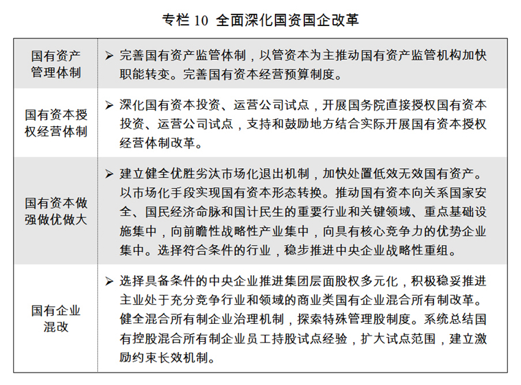 五是深化國資國企改革。完善各類國有資產(chǎn)管理體制,以管資本為主加快轉(zhuǎn)變國有資產(chǎn)監(jiān)管機構(gòu)職能,改革國有資本授權(quán)經(jīng)營體制。加快國有經(jīng)濟布局優(yōu)化、結(jié)構(gòu)調(diào)整、戰(zhàn)略性重組,以資本為紐帶促進各類所有制企業(yè)優(yōu)勢互補,推動國有資本做強做優(yōu)做大。積極穩(wěn)妥推進國有企業(yè)股權(quán)多元化和混合所有制改革,進一步推動重點領(lǐng)域混合所有制改革試點,培育具有全球競爭力的世界一流企業(yè)。深化國有林區(qū)林場、農(nóng)墾改革。