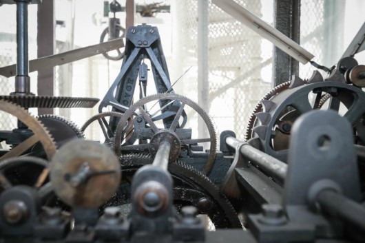 大鐘機(jī)芯內(nèi),大量齒輪互相咬合,直徑超過(guò)12毫米的鋼絲繩代替了普通鐘表中精細(xì)的鋼絲。(海沙爾 攝)