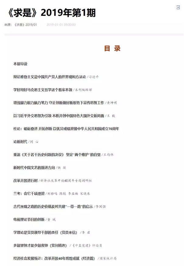 剛剛出版的2019年第1期首發(fā)了習近平總書記重要文章《辯證唯物主義是中國共產(chǎn)黨人的世界觀和方法論》,配發(fā)了學習習近平總書記重要文章的編輯部文章《學好用好馬克思主義哲學這個看家本領》。