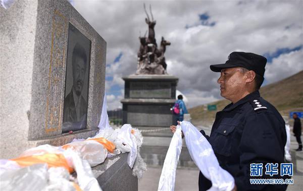索南達杰的侄子秋培扎西向索南達杰烈士紀念碑敬獻哈達(2018年8月10日攝)。 新華社記者 吳剛 攝