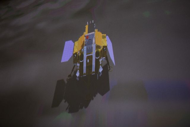 圖為1月3日在北京航天飛行控制中心拍攝的嫦娥四號探測器展開太陽翼(示意圖)。1月3日10時26分,嫦娥四號探測器自主著陸在月球背面南極-艾特肯盆地內(nèi)的馮·卡門撞擊坑內(nèi),實現(xiàn)人類探測器首次在月球背面軟著陸。新華社記者 金立旺 攝