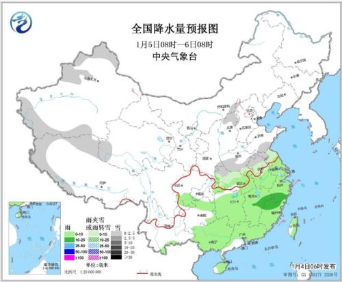 受高空槽影響,4日至5日,陜西南部、河南南部、山東南部、蘇皖北部、湖北西部等地有小雪或雨夾雪,局地有中到大雪;南方大部地區(qū)有小到中雨,江西中北部、浙江中部等地的部分地區(qū)有大雨。