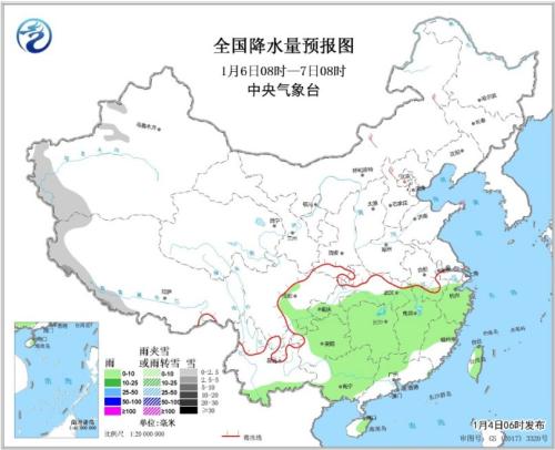 1月4日08時至5日08時,黑龍江中東部、北疆北部和南疆西部山區(qū)、青海中東部、西藏東部和西部、川西高原、陜西中南部、湖北西部、黃淮西部和東南部等地的部分地區(qū)有小雪或雨夾雪;江漢、江淮及其以南大部地區(qū)、西南地區(qū)東部和南部等地的部分地區(qū)有小到中雨,江西中北部、浙江中部和廣西東北部等地的部分地區(qū)有大雨(25~35毫米)。內(nèi)蒙古中北部、黑龍江東北部、遼東半島和山東半島等地的部分地區(qū)有4~6級及以上風(見圖1)。北部灣、瓊州海峽、廣東西部沿岸部分海域?qū)⒂写箪F天氣。