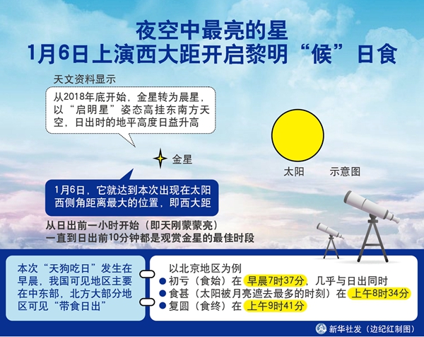 新華社天津1月4日電(記者周潤?。τ谔煳膼酆谜邅碚f,本月6日注定會是一個忙碌的早晨,看完西大距的金星,就可以繼續(xù)欣賞一次精彩的日偏食。