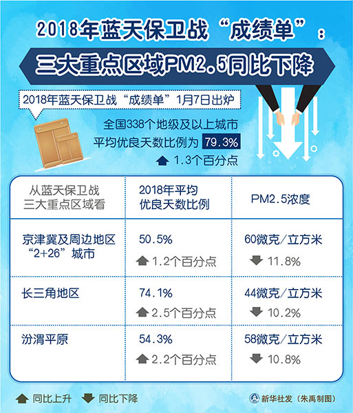 圖表:2018年藍天保衛(wèi)戰(zhàn)“成績單”:三大重點區(qū)域PM2.5同比下降 新華社發(fā) 朱禹 制圖