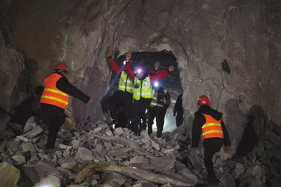 此外,施工隊也采取了一系列措施保證工人的安全。中鐵十八局安全總監(jiān)周連軍介紹,管廊內(nèi)環(huán)境封閉,空氣不流通,爆破產(chǎn)生的二氧化硫氣體以及運輸車排放的尾氣容易在管廊內(nèi)沉積,對施工人員產(chǎn)生危害。施工隊為此設置了通風管道,從外引入新鮮空氣,將管廊內(nèi)的空氣排出。同時,每位工人在施工時都需要佩戴口罩。為了防止管廊中的巖石脫落,施工隊還特意在管廊四壁噴涂了10厘米左右的混凝土,對洞內(nèi)的花崗巖進行加固。