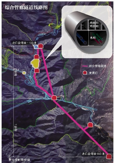 怎樣把對生態(tài)環(huán)境的影響降到最低是施工隊面臨的另一項考驗。在施工方案的選擇上,設計團隊曾想過另外一種建設方案,但最終被否定。“最初的方案是在山坡上做溝渠,從山下把水運送到山上,但這種方法只能用來運水,而且要砍伐大量樹木,生態(tài)破壞嚴重?!?韓寶江說,采用地下綜合管廊的建設方式,不但可以同時輸送電力和水,而且伐樹少,占地面積小,能夠最大程度保護山體生態(tài)環(huán)境。為減少對野生動物生活習性的影響,施工隊在爆破時也盡可能在白天進行。