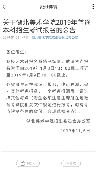 1月6日,湖北美術(shù)學(xué)院發(fā)布的報(bào)名時(shí)間順延通告。