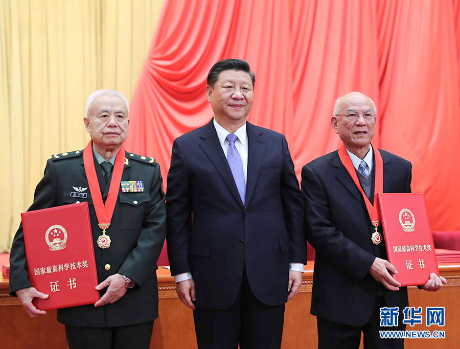1月8日,2018年度國家科學技術獎勵大會在北京人民大會堂隆重舉行。中共中央總書記、國家主席、中央軍委主席習近平向獲得2018年度國家最高科學技術獎的哈爾濱工業(yè)大學劉永坦院士(右)和中國人民解放軍陸軍工程大學錢七虎院士(左)頒獎。 新華社記者 謝環(huán)馳 攝