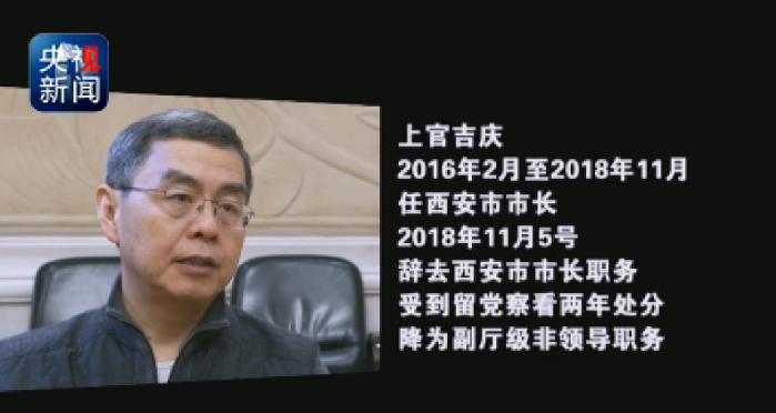 上官吉慶,2016年2月至2018年11月任西安市市長,2018年11月5號(hào)辭去西安市市長職務(wù),受到留黨察看兩年處分,降為副廳級(jí)非領(lǐng)導(dǎo)職務(wù)。