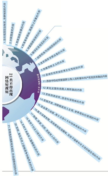 《規(guī)范》和《細(xì)則》針對(duì)網(wǎng)絡(luò)視聽(tīng)領(lǐng)域存在的不足和薄弱環(huán)節(jié),分別對(duì)開(kāi)展短視頻服務(wù)的網(wǎng)絡(luò)平臺(tái)以及網(wǎng)絡(luò)短視頻內(nèi)容審核的標(biāo)準(zhǔn)進(jìn)行規(guī)范?!都?xì)則》明確了21類、100項(xiàng)內(nèi)容,“喪文化”“一夜情”“非主流婚戀觀”等都不得出現(xiàn)在短視頻中。