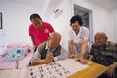 去年9月12日,安貞街道安華怡園養(yǎng)老照料中心開門迎客,入住老人在房間里練習書法。資料圖片/記者 王飛 攝