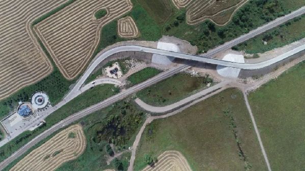 平改立工程烏爾其汗煤田森林檢查站附近,可以看“S”型的橋梁如果彎道曲度適當(dāng),應(yīng)當(dāng)穿過林業(yè)局的檢查站。(8月28日航拍圖)達(dá)日罕攝