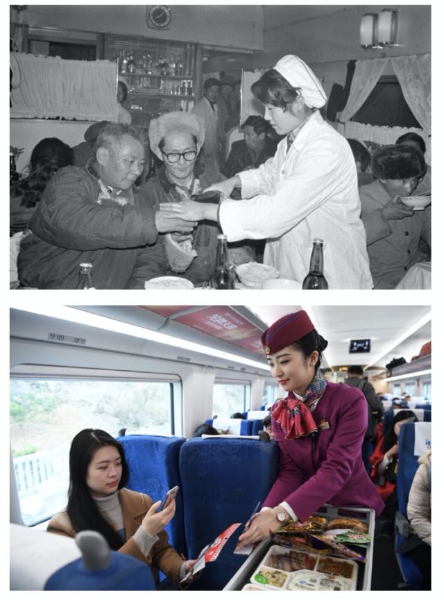 上圖:1982年,榮獲鐵道部流動優(yōu)勝紅旗的呼和浩特至北京89/90次列車,在春運期間熱情為旅客服務。(新華社記者 白斯古郎 攝);下圖:2018年春運期間,乘客在重慶至成都G8510次列車上用手機支付購買小吃。(新華社記者 王全超 攝)