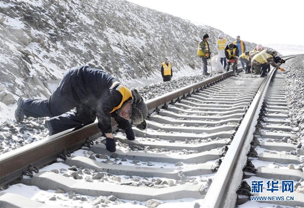 青藏鐵路格爾木工務(wù)段望昆線路養(yǎng)護(hù)車間副主任于本蕃(前)跪在鐵路上對已完成檢修的鐵軌進(jìn)行復(fù)檢(1月11日攝)。 新華社發(fā)(王浡 攝)