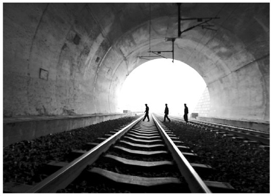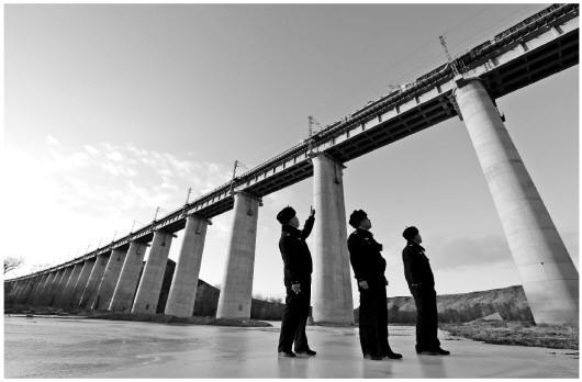 圖① 冬季瑟爾基河冰封,橋下經(jīng)常有人穿行。為防止橋上石砟因火車經(jīng)過震動落下砸到人,民警經(jīng)常踏冰巡視。