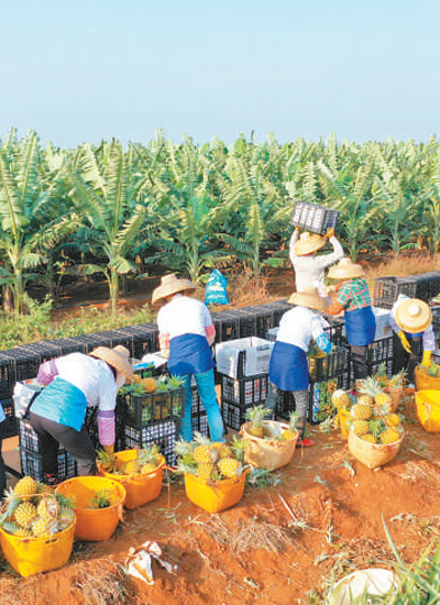 廣東湛江市徐聞縣盛產(chǎn)菠蘿,種植面積達(dá)35萬(wàn)畝,年產(chǎn)量近50萬(wàn)噸。春節(jié)臨近,菠蘿開(kāi)始大量上市。圖為村民在田間將菠蘿打包裝車,準(zhǔn)備銷往全國(guó)各地。羅艾樺 陳北跑攝影報(bào)道