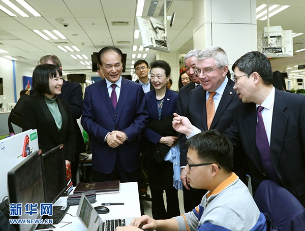 1月30日,新華社社長蔡名照在北京會(huì)見國際奧委會(huì)主席巴赫。這是蔡名照陪同巴赫參觀新華社新聞信息發(fā)稿中心。新華社記者 鞠鵬 攝