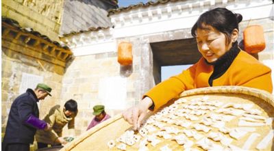圖為江西省撫州市金溪縣竹橋古村,當(dāng)?shù)卮迕裰谱鱾鹘y(tǒng)食品,迎接新春。新華社記者 彭昭之?dāng)z