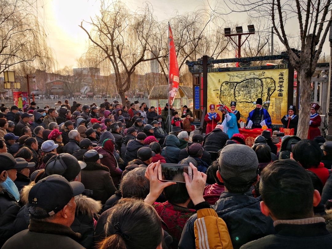 2019-01-05,山東省濟南市百花洲。臨近春節(jié),在濟南百花洲畔,非遺地方戲曲展演正在上演,吸引過往游人層層圍觀、駐足叫好。作者:地伐