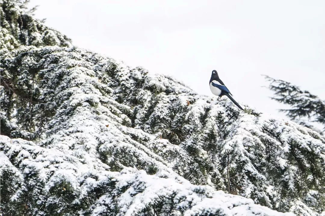 2019-01-10,遼寧省大連市。喜鵲站在落滿雪的樹梢上,告訴我們,春不久就會來了。作者:123