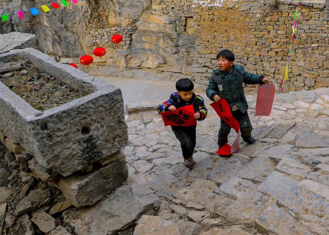 2019-01-29,河北省涉縣大洼村。新春到來之際,書畫大師下鄉(xiāng)進(jìn)山溝,揮毫潑墨送溫暖,倆村娃興致勃勃將福字春聯(lián)帶回家。作者:滄海