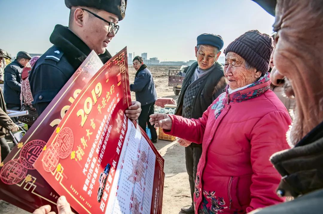2019-02-01,山東省濟(jì)南市潘莊村。就在這家家戶戶都在忙年的時(shí)刻,交警來到集上為趕集人贈(zèng)送年歷,提醒人們節(jié)日期間注意交通安全。作者:程普麟