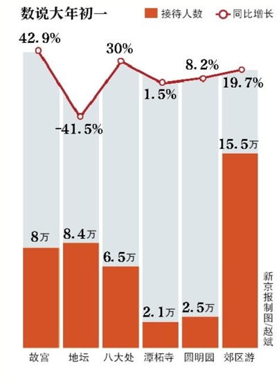 昨天是農歷大年初一,“春節(jié)”假日第二天,記者從北京市假日辦獲悉,當日,全市重點監(jiān)測的146家旅游景區(qū)共接待游客112.63萬人次,其中故宮博物院共接待8萬人次,同比增長42.9%;廟會等各類民俗活動共接待40.1萬人次。市屬11家公園及園博館共迎來游客25萬人次,同比去年增長11%。各公園開展了傳統(tǒng)園林賀歲、鮮花廟會及非遺技藝、經典展陳等不同形式的游園活動,給來園市民游客拜大年、送福氣。
