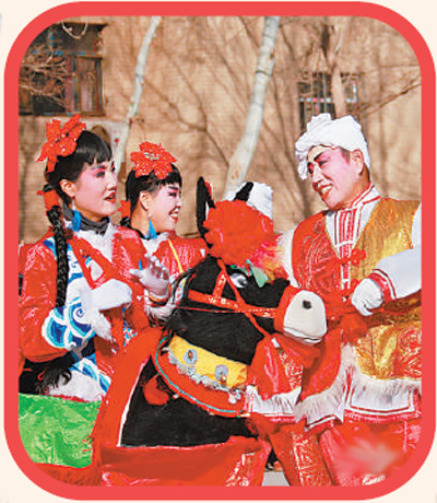 甘肅敦煌市2019迎新春社火大賽活動現(xiàn)場,參賽隊員表演社火跑驢。張曉亮攝(人民視覺)