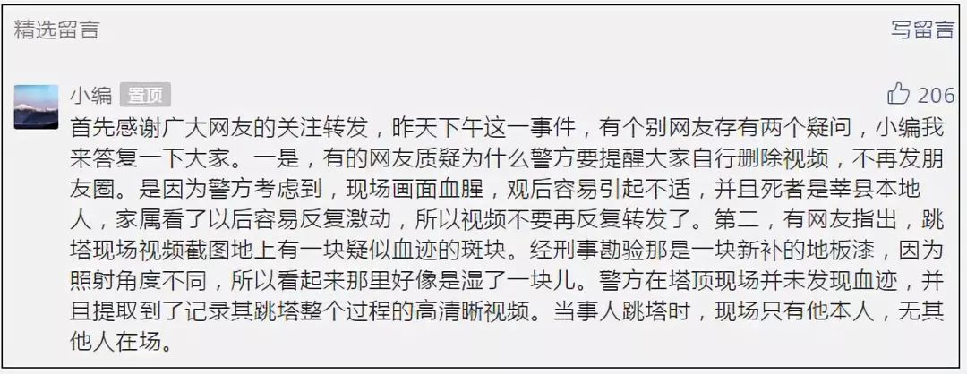 “我們就在通報的基礎(chǔ)上,通過留言進行了辟謠和提醒?!本奖硎?,就此事有個別網(wǎng)友存有兩個疑問:一是,質(zhì)疑為什么警方要提醒大家自行刪除視頻。警方解釋,現(xiàn)場畫面血腥,觀后容易引起不適,并且死者是莘縣本地人,家屬看了以后容易反復激動。二是,網(wǎng)友指出,跳塔現(xiàn)場視頻截圖地上有一塊疑似血跡的斑塊。經(jīng)刑事勘驗那是一塊新補的地板漆,因照射角度不同,所以看起來那里好像是濕了一塊兒。警方在現(xiàn)場并未發(fā)現(xiàn)血跡,此外,當事人跳塔時,現(xiàn)場只有他本人。