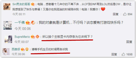 有網(wǎng)友表示,對廣大“單身狗”來說,平時陪伴自己時間最多,最了解自己的就是電腦了。因此,今天最重要的事就是為電腦慶祝生日。這條建議迅速得到其他網(wǎng)友的熱烈響應,網(wǎng)友“SupreMerio”提議,今天要為電腦更換主板顯卡和內(nèi)存條來慶祝。