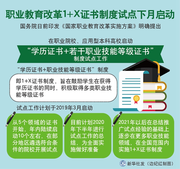 新華社北京2月19日電(記者胡浩)國(guó)務(wù)院日前印發(fā)《國(guó)家職業(yè)教育改革實(shí)施方案》明確提出,在職業(yè)院校、應(yīng)用型本科高校啟動(dòng)“學(xué)歷證書+若干職業(yè)技能等級(jí)證書”制度試點(diǎn)工作。記者19日從教育部獲悉,這一試點(diǎn)工作計(jì)劃于2019年3月啟動(dòng)。