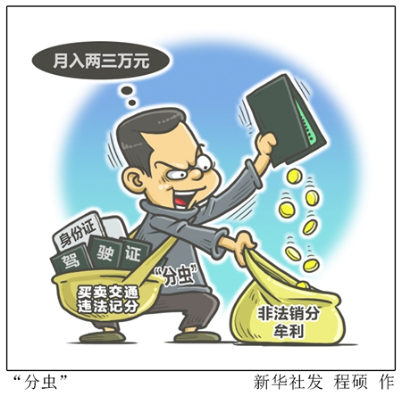 隨著私家車數(shù)量的持續(xù)快速增長,一些司機(jī)由于一年內(nèi)違章次數(shù)較多,自己駕照記分不夠扣,由此催生了交通違法記分非法買賣現(xiàn)象。其中,低價買分、高價賣分的“分蟲”,成為這條產(chǎn)業(yè)鏈上的關(guān)鍵。