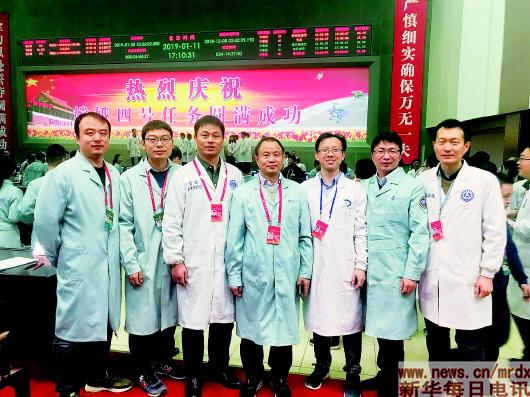 ▲1月11日,北京航天飛行控制中心,科普載荷總設(shè)計(jì)師謝更新(右四)、副總指揮楊小俊(右五)、主任設(shè)計(jì)師張?jiān)獎(jiǎng)?右二)以及航天五院、中科院光電所等單位參研人員合影慶祝嫦娥四號(hào)任務(wù)圓滿成功。 受訪者供圖